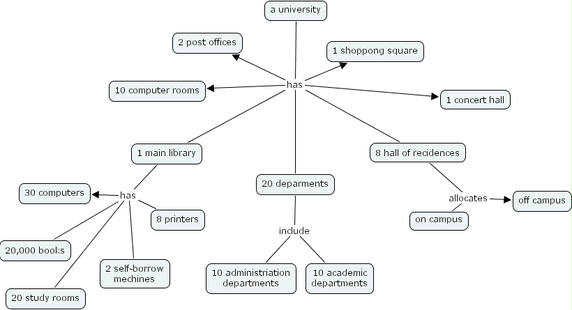 20 deparments include 10 administriation departments, 20 deparments include 10 academic departments, a university has 1 main library, a university has 20 deparments, a university has 1 shoppong square, a university has 1 concert hall, a university has 8 hall of recidences, a university has 10 computer rooms, a university has 2 post offices, 8 hall of recidences allocates on campus, 8 hall of recidences allocates off campus, 1 main library has 2 self-borrow mechines, 1 main library has 20 study rooms, 1 main library has 30 computers, 1 main library has 20,000 books, 1 main library has 8 printers