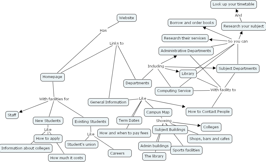 Existing Students Like Careers , Existing Students Like Student's union, Administrative Departments So you can Borrow and order books, Administrative Departments So you can Research your subject, Administrative Departments So you can Research their services, Homepage With facilities for New Students, Homepage With facilities for Existing Students, Homepage With facilities for Staff, Departments Including Computing Service, Departments Including Subject Departments, Departments Including Administrative Departments, Departments Including Library, Subject Departments With facility to How to Contact People, Subject Departments So you can Borrow and order books, Subject Departments So you can Research your subject, Subject Departments So you can Research their services, Computing Service With facility to How to Contact People, Research your subject And Look up your timetable, Library With facility to How to Contact People, Website Has Homepage, Administrative Departments With facility to How to Contact People, Computing Service So you can Borrow and order books, Computing Service So you can Research your subject, Computing Service So you can Research their services, General Information Like How and when to pay fees, General Information Like Term Dates, General Information Like How to Contact People, General Information Like Campus Map, New Students Like How to apply, New Students Like Information about colleges, New Students Like How much it costs, Campus Map Showing Subject Buildings, Campus Map Showing Sports facilities, Campus Map Showing The library, Campus Map Showing Shops, bars and cafes, Campus Map Showing Colleges, Campus Map Showing Admin buildings, Library So you can Borrow and order books, Library So you can Research your subject, Library So you can Research their services, Homepage Links to General Information, Homepage Links to Departments