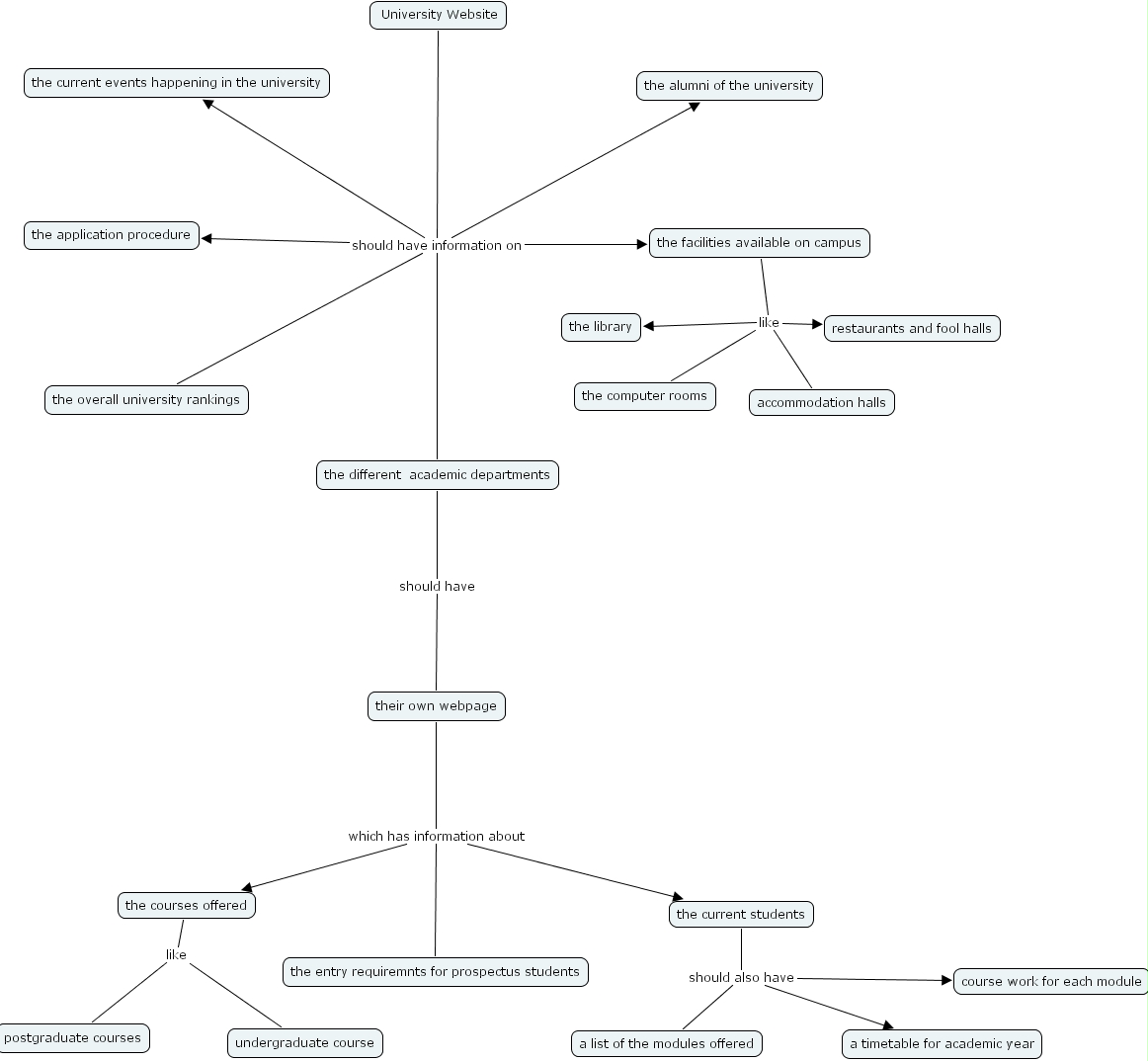 the courses offered like undergraduate course, the courses offered like postgraduate courses, University Website should have information on the facilities available on campus, University Website should have information on the different academic departments, University Website should have information on the alumni of the university, University Website should have information on the overall university rankings, University Website should have information on the current events happening in the university, University Website should have information on the application procedure, the current students should also have a timetable for academic year, the current students should also have course work for each module, the current students should also have a list of the modules offered, the facilities available on campus like the library, the facilities available on campus like restaurants and fool halls, the facilities available on campus like accommodation halls, the facilities available on campus like the computer rooms, the different academic departments should have their own webpage, their own webpage which has information about the courses offered, their own webpage which has information about the current students, their own webpage which has information about the entry requiremnts for prospectus students