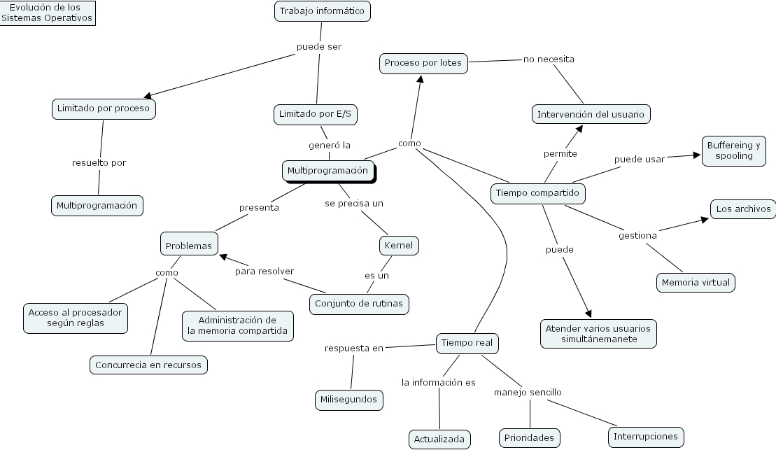 Proceso por lotes no necesita Intervenci�n del usuario, Trabajo inform�tico puede ser Limitado por proceso, Trabajo inform�tico puede ser Limitado por E/S, Multiprogramaci�n presenta Problemas, Tiempo compartido puede Atender varios usuarios simult�nemanete, Multiprogramaci�n como Tiempo compartido, Multiprogramaci�n como Proceso por lotes, Limitado por proceso resuelto por Multiprogramaci�n, Kernel es un Conjunto de rutinas, Tiempo real como Tiempo compartido, Tiempo real como Proceso por lotes, Multiprogramaci�n se precisa un Kernel, Tiempo compartido gestiona Memoria virtual, Tiempo compartido gestiona Los archivos, Tiempo compartido permite Intervenci�n del usuario, Tiempo real la informaci�n es Actualizada, Conjunto de rutinas para resolver Problemas, Tiempo compartido puede usar Buffereing y spooling, Tiempo real respuesta en Milisegundos, Problemas como Administraci�n de la memoria compartida, Problemas como Acceso al procesador seg�n reglas, Problemas como Concurrecia en recursos, Tiempo real manejo sencillo Interrupciones, Tiempo real manejo sencillo Prioridades, Limitado por E/S gener� la Multiprogramaci�n