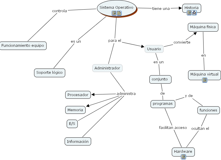 funciones ocultan el Hardware, programas y de funciones, programas facilitan acceso Hardware, Sistema Operativo controla Funcionamiento equipo, Sistema Operativo tiene una Historia, M�quina f�sica en M�quina virtual, Sistema Operativo para el Usuario, Sistema Operativo para el Administrador, Sistema Operativo es un Soporte l�gico, Usuario es un conjunto , Usuario convierte M�quina f�sica, conjunto de programas, Administrador administra Procesador, Administrador administra Informaci�n, Administrador administra Memoria, Administrador administra E/S