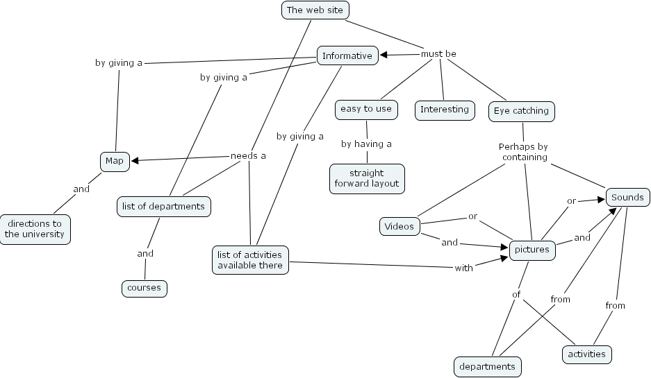 Informative by giving a list of departments, The web site must be Eye catching, The web site must be easy to use, The web site must be Informative, The web site must be Interesting, Informative by giving a Map, pictures or Sounds, Eye catching Perhaps by containing pictures, Eye catching Perhaps by containing Videos, Eye catching Perhaps by containing Sounds, list of activities available there with pictures, list of departments and courses, Videos or pictures, easy to use by having a straight forward layout, Videos and pictures, The web site needs a Map, The web site needs a list of departments, The web site needs a list of activities available there, Map and directions to the university, pictures of activities, pictures of departments, Sounds from activities, pictures and Sounds, Informative by giving a list of activities available there, Sounds from departments