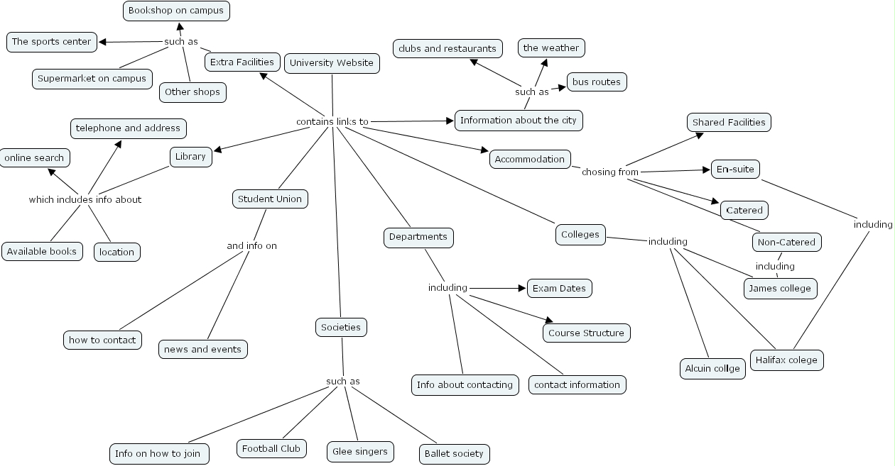 University Website contains links to Societies, University Website contains links to Accommodation, University Website contains links to Information about the city, University Website contains links to Library, University Website contains links to Student Union, University Website contains links to Extra Facilities, University Website contains links to Departments, University Website contains links to Colleges, Information about the city such as the weather, Information about the city such as bus routes, Information about the city such as clubs and restaurants, Departments including Info about contacting, Departments including Course Structure, Departments including Exam Dates, Departments including contact information, Extra Facilities such as The sports center, Extra Facilities such as Other shops, Extra Facilities such as Bookshop on campus, Extra Facilities such as Supermarket on campus, Accommodation chosing from Non-Catered, Accommodation chosing from Shared Facilities, Accommodation chosing from Catered, Accommodation chosing from En-suite, Societies such as Football Club, Societies such as Info on how to join , Societies such as Glee singers, Societies such as Ballet society, Library which includes info about Available books, Library which includes info about online search, Library which includes info about location, Library which includes info about telephone and address, En-suite including Halifax colege, Non-Catered including James college, Colleges including Alcuin collge, Colleges including Halifax colege, Colleges including James college, Student Union and info on how to contact, Student Union and info on news and events
