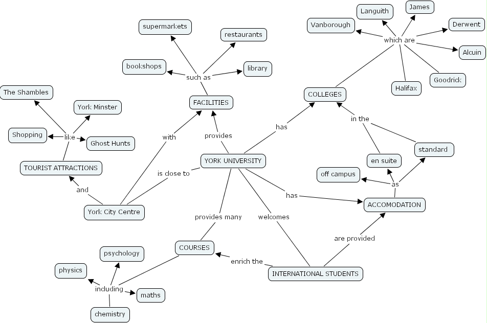 York City Centre and TOURIST ATTRACTIONS, INTERNATIONAL STUDENTS enrich the COURSES, TOURIST ATTRACTIONS like Ghost Hunts, TOURIST ATTRACTIONS like Shopping, TOURIST ATTRACTIONS like York Minster, TOURIST ATTRACTIONS like The Shambles, YORK UNIVERSITY provides many COURSES, YORK UNIVERSITY has ACCOMODATION, INTERNATIONAL STUDENTS are provided ACCOMODATION, York City Centre with FACILITIES, en suite in the COLLEGES, ACCOMODATION as standard , ACCOMODATION as en suite, ACCOMODATION as off campus, YORK UNIVERSITY is close to York City Centre, YORK UNIVERSITY has COLLEGES, COURSES including psychology, COURSES including physics, COURSES including maths, COURSES including chemistry, FACILITIES such as library, FACILITIES such as restaurants, FACILITIES such as bookshops, FACILITIES such as supermarkets, YORK UNIVERSITY welcomes INTERNATIONAL STUDENTS, COLLEGES which are Halifax, COLLEGES which are Alcuin, COLLEGES which are James, COLLEGES which are Languith, COLLEGES which are Vanborough, COLLEGES which are Goodrick, COLLEGES which are Derwent, YORK UNIVERSITY provides FACILITIES, standard in the COLLEGES
