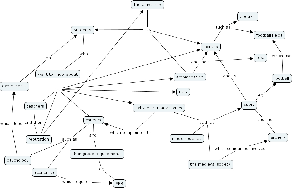 the medieval society which sometimes involves archery, reputation of The University, accomodation and their cost, accomodation and their facilites, football which uses football fields, experiments on Students, sport such as archery, Students who want to know about, courses and their grade requirements, facilites such as football fields, facilites such as the gym, extra curricular activites which complement their courses, extra curricular activites such as the medieval society, extra curricular activites such as music societies, extra curricular activites such as sport, want to know about the facilites, want to know about the NUS, want to know about the extra curricular activites, want to know about the accomodation, want to know about the teachers, want to know about the reputation, want to know about the courses, The University has facilites, The University has accomodation, The University has Students, economics which requires ABB, sport and its facilites, courses such as psychology, courses such as economics, psychology which does experiments, their grade requirements eg ABB, sport eg football, teachers and their reputation