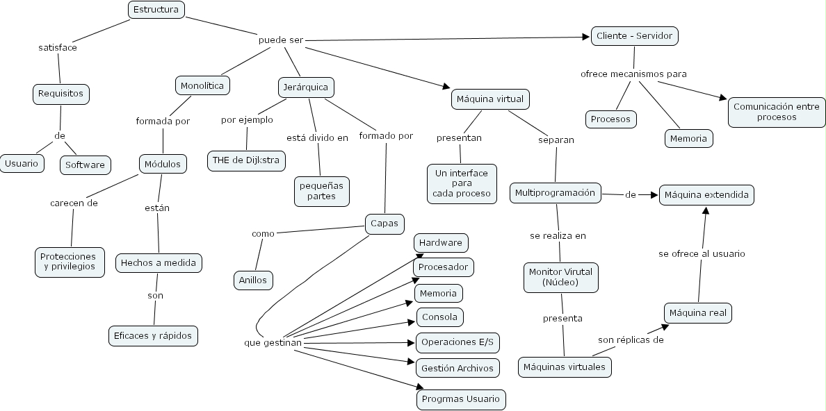 Monol�tica formada por M�dulos, Cliente - Servidor ofrece mecanismos para Memoria, Cliente - Servidor ofrece mecanismos para Comunicaci�n entre procesos, Cliente - Servidor ofrece mecanismos para Procesos, Requisitos de Usuario, Requisitos de Software, M�dulos carecen de Protecciones y privilegios, Capas que gestinan Procesador, Capas que gestinan Gesti�n Archivos, Capas que gestinan Hardware, Capas que gestinan Memoria, Capas que gestinan Operaciones E/S, Capas que gestinan Progrmas Usuario, Capas que gestinan Consola, Multiprogramaci�n de M�quina extendida, Hechos a medida son Eficaces y r�pidos, Estructura satisface Requisitos, M�quinas virtuales son r�plicas de M�quina real, Jer�rquica por ejemplo THE de Dijkstra, M�quina virtual separan Multiprogramaci�n, Monitor Virutal (N�cleo) presenta M�quinas virtuales, Jer�rquica formado por Capas, Multiprogramaci�n se realiza en Monitor Virutal (N�cleo), M�dulos est�n Hechos a medida, M�quina virtual presentan Un interface para cada proceso, Estructura puede ser Cliente - Servidor, Estructura puede ser Jer�rquica, Estructura puede ser M�quina virtual, Estructura puede ser Monol�tica, Jer�rquica est� divido en peque�as partes, Capas como Anillos, M�quina real se ofrece al usuario M�quina extendida