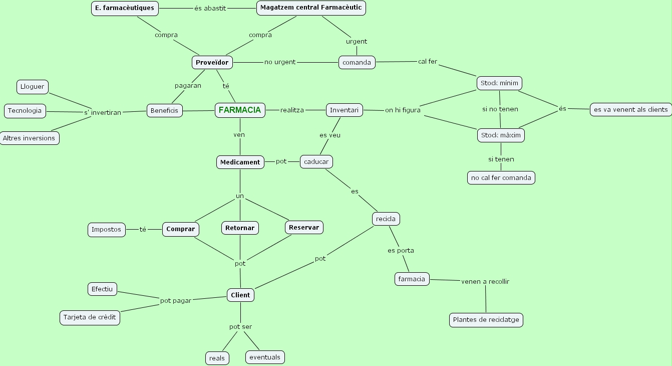 FARMACIA realitza Inventari, farmacia venen a recollir Plantes de reciclatge, Prove�dor compra E. farmac�utiques, Stock m�nim cal fer comanda, FARMACIA ???? Beneficis, Magatzem central Farmac�utic �s abastit E. farmac�utiques, Prove�dor compra Magatzem central Farmac�utic, Beneficis s' invertiran Altres inversions, Beneficis s' invertiran Tecnologia, Beneficis s' invertiran Lloguer, Comprar t� Impostos, FARMACIA ven Medicament, Stock m�xim si no tenen Stock m�nim, Client pot Retornar, Client pot Comprar, Client pot Reservar, caducar es veu Inventari, comanda urgent Magatzem central Farmac�utic, comanda no urgent Prove�dor, Stock m�xim si tenen no cal fer comanda, Retornar un Medicament, Stock m�nim �s es va venent als clients, Client pot ser eventuals, Client pot ser reals, FARMACIA t� Prove�dor, Inventari on hi figura Stock m�nim, Inventari on hi figura Stock m�xim, Stock m�xim �s es va venent als clients, Client pot pagar Efectiu, Client pot pagar Tarjeta de cr�dit, Medicament pot caducar, recicla es porta farmacia, Beneficis pagaran Prove�dor, caducar es recicla, Reservar un Medicament, Comprar un Medicament, Client pot recicla