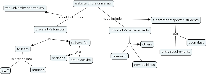 university's function is to have fun, university's function is to learn, website of the university need include a part for prospected students, website of the university need include university's achievements, website of the university should introduce the university and the city, website of the university should introduce university's function, university's achievements on others, university's achievements on new buildings, university's achievements on research , a part for prospected students e.g open days, a part for prospected students e.g entry requirements, to have fun e.g group activits, to have fun e.g socioties, to learn is divided into student, to learn is divided into stuff