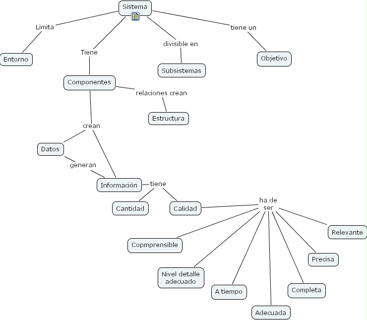 Datos generan Informaci�n, Sistema Tiene Componentes, Calidad ha de ser Completa, Calidad ha de ser Adecuada, Calidad ha de ser Nivel detalle adecuado, Calidad ha de ser Relevante, Calidad ha de ser Precisa, Calidad ha de ser A tiempo, Calidad ha de ser Copmprensible, Informaci�n tiene Cantidad, Informaci�n tiene Calidad, Componentes relaciones crean Estructura, Sistema Limita Entorno, Componentes crean Informaci�n, Componentes crean Datos, Sistema divisible en Subsistemas, Sistema tiene un Objetivo
