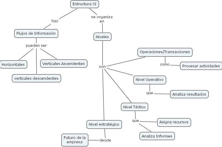 Flujos de Informaci�n pueden ser verticales descendentes, Flujos de Informaci�n pueden ser Horizontales, Flujos de Informaci�n pueden ser Verticales Ascendentes, Estructura SI se organiza en Niveles, Nivel T�ctico que Analiza Informes, Nivel Operativo son Nivel T�ctico, Nivel Operativo son Nivel estrat�gico, Asigna recursos que Analiza Informes, Operaciones/Transacciones son Nivel T�ctico, Operaciones/Transacciones son Nivel estrat�gico, Niveles son Nivel T�ctico, Niveles son Nivel estrat�gico, Estructura SI hay Flujos de Informaci�n