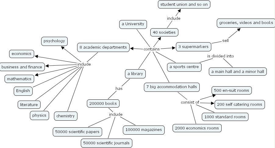 40 societies include student union and so on, a University contains 3 supermarkers, a University contains 40 societies, a University contains 8 academic departments, a University contains a sports centre, a University contains a library, a University contains 7 big accommodation halls, a library has 200000 books, 3 supermarkers sell groceries, videos and books, 200000 books include 100000 magazines, 200000 books include 50000 scientific journals, 200000 books include 50000 scientific papers, 8 academic departments include English, 8 academic departments include business and finance, 8 academic departments include literature, 8 academic departments include mathematics, 8 academic departments include chemistry, 8 academic departments include physics, 8 academic departments include psychology, 8 academic departments include economics, a sports centre is divided into a main hall and a minor hall, 7 big accommodation halls consist of 500 en-suit rooms, 7 big accommodation halls consist of 1000 standard rooms, 7 big accommodation halls consist of 200 self catering rooms, 7 big accommodation halls consist of 2000 economics rooms