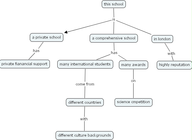a private school has private fianancial support, in london with highly reputation, this school is a comprehensive school, this school is a private school, this school is in london, many awards on science cmpetition, a comprehensive school has many international students, a comprehensive school has many awards, many international students come from different countries, different countries with different culture backgrounds