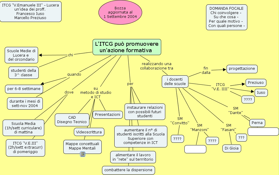 i docenti delle scuole SM "Convitto" ????, i docenti delle scuole SM "Dante" Perna, i docenti delle scuole SM "Dante" Ida Di Battista, i docenti delle scuole SM "Fasani" ???, i docenti delle scuole SM "Fasani" Di Gioia, L'ITCG pu� promuovere un'azione formativa quando per 6-8 settimane, L'ITCG pu� promuovere un'azione formativa quando durante i mesi di sett-nov 2004, i docenti delle scuole fin dalla progettazione, i docenti delle scuole ITCG "V.E. IIII" ????, i docenti delle scuole ITCG "V.E. IIII" Preziuso, i docenti delle scuole ITCG "V.E. IIII" Iuso, L'ITCG pu� promuovere un'azione formativa chi studenti della 3^ classe, L'ITCG pu� promuovere un'azione formativa chi Scuole Medie di Lucera e del circondario, L'ITCG pu� promuovere un'azione formativa realizzando una collaborazione tra i docenti delle scuole, L'ITCG pu� promuovere un'azione formativa per combattere la dispersione, L'ITCG pu� promuovere un'azione formativa per aumentare il n� di studenti iscritti alla Scuola Superiore con competenze in ICT, L'ITCG pu� promuovere un'azione formativa per instaurare relazioni con possibili futuri studenti, L'ITCG pu� promuovere un'azione formativa per alimentare il lavoro in "rete" sul terrritorio, L'ITCG pu� promuovere un'azione formativa su metodo di studio e ICT Presentazioni, L'ITCG pu� promuovere un'azione formativa su metodo di studio e ICT Mappe concettuali Mappe Mentali, L'ITCG pu� promuovere un'azione formativa su metodo di studio e ICT CAD Disegno Tecnico, L'ITCG pu� promuovere un'azione formativa su metodo di studio e ICT Videoscrittura, i docenti delle scuole SM "Manzoni" ????, i docenti delle scuole SM "Manzoni" Mastrolilli, L'ITCG pu� promuovere un'azione formativa dove ITCG "V.E.III" (2h/sett extracurr) di pomeriggio, L'ITCG pu� promuovere un'azione formativa dove Scuola Media (1h/sett curriculare) di mattina
