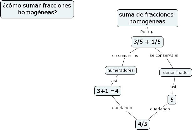 3/5 + 1/5 se suman los numeradores, 5 quedando 4/5, suma de fracciones homog�neas Por ej. 3/5 + 1/5, 3/5 + 1/5 se conserva el denominador, denominador as� 5, numeradores as� 3+1 =4, 3+1 =4 quedando 4/5