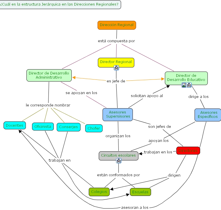 Asesores Supersisores son jefes de Directores, Asesores Supersisores organizan los Circuitos escolares, Directores dirigen Escuelas, Directores dirigen Colegios, Director de Desarrollo Administrativo le corresponde nombrar Chofer, Director de Desarrollo Administrativo le corresponde nombrar Oficinista, Director de Desarrollo Administrativo le corresponde nombrar Conserjes, Director de Desarrollo Administrativo le corresponde nombrar Docentes, Director Regional es jefe de Director de Desarrollo Administrativo, Director Regional es jefe de Director de Desarrollo Educativo, Director Regional es jefe de Asesores Supersisores, Asesores Supersisores solicitan apoyo al Director de Desarrollo Educativo, Circuitos escolares est�n conformados por Escuelas, Circuitos escolares est�n conformados por Colegios, Asesores Espec�ficos asesoran a los Docentes, Asesores Espec�ficos apoyan los Circuitos escolares, Directores trabajan en los Circuitos escolares, Docentes trabajan en Escuelas, Docentes trabajan en Colegios, Director de Desarrollo Administrativo se apoyan en los Asesores Supersisores, Conserjes trabajan en Escuelas, Conserjes trabajan en Colegios, Direcci�n Regional est� compuesta por Director Regional, Direcci�n Regional est� compuesta por Director de Desarrollo Educativo, Direcci�n Regional est� compuesta por Director de Desarrollo Administrativo, Oficinista trabajan en Escuelas, Oficinista trabajan en Colegios, Director de Desarrollo Educativo dirige a los Asesores Espec�ficos