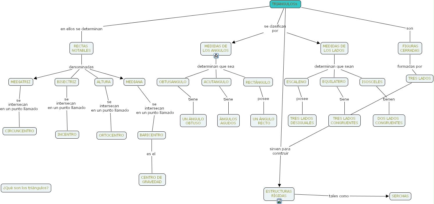 EQUILATERO tiene TRES LADOS CONGRUENTES, RECTAS NOTABLES denominadas MEDIATRIZ, RECTAS NOTABLES denominadas ALTURA, RECTAS NOTABLES denominadas MEDIANA, RECTAS NOTABLES denominadas BISECTRIZ, MEDIDAS DE LOS LADOS determinan que sean ISOSCELES, MEDIDAS DE LOS LADOS determinan que sean ESCALENO, MEDIDAS DE LOS LADOS determinan que sean EQUILATERO, MEDIANA se intersecan en un punto llamado BARICENTRO, ACUTANGULO tiene �NGULOS AGUDOS, MEDIDAS DE LOS ANGULOS determinan que sea RECT�NGULO, MEDIDAS DE LOS ANGULOS determinan que sea OBTUSANGULO, MEDIDAS DE LOS ANGULOS determinan que sea ACUTANGULO, BARICENTRO es el CENTRO DE GRAVEDAD, ISOSCELES tienen DOS LADOS CONGRUENTES, ESTRUCTURAS R�GIDAS tales como SERCHAS, TRIANGULOSs se clasifican por MEDIDAS DE LOS ANGULOS, TRIANGULOSs se clasifican por MEDIDAS DE LOS LADOS, FIGURAS CERRADAS formadas por TRES LADOS, ESCALENO posee TRES LADOS DESIGUALES, BISECTRIZ se intersecan en un punto llamado INCENTRO, TRIANGULOSs son FIGURAS CERRADAS, MEDIATRIZ se intersecan en un punto llamado CIRCUNCENTRO, TRIANGULOSs en ellos se determinan RECTAS NOTABLES, RECT�NGULO posee UN �NGULO RECTO, TRIANGULOSs sirven para construir ESTRUCTURAS R�GIDAS, OBTUSANGULO tiene UN �NGULO OBTUSO, TRES LADOS sirven para construir ESTRUCTURAS R�GIDAS, ALTURA se intersecan en un punto llamado ORTOCENTRO