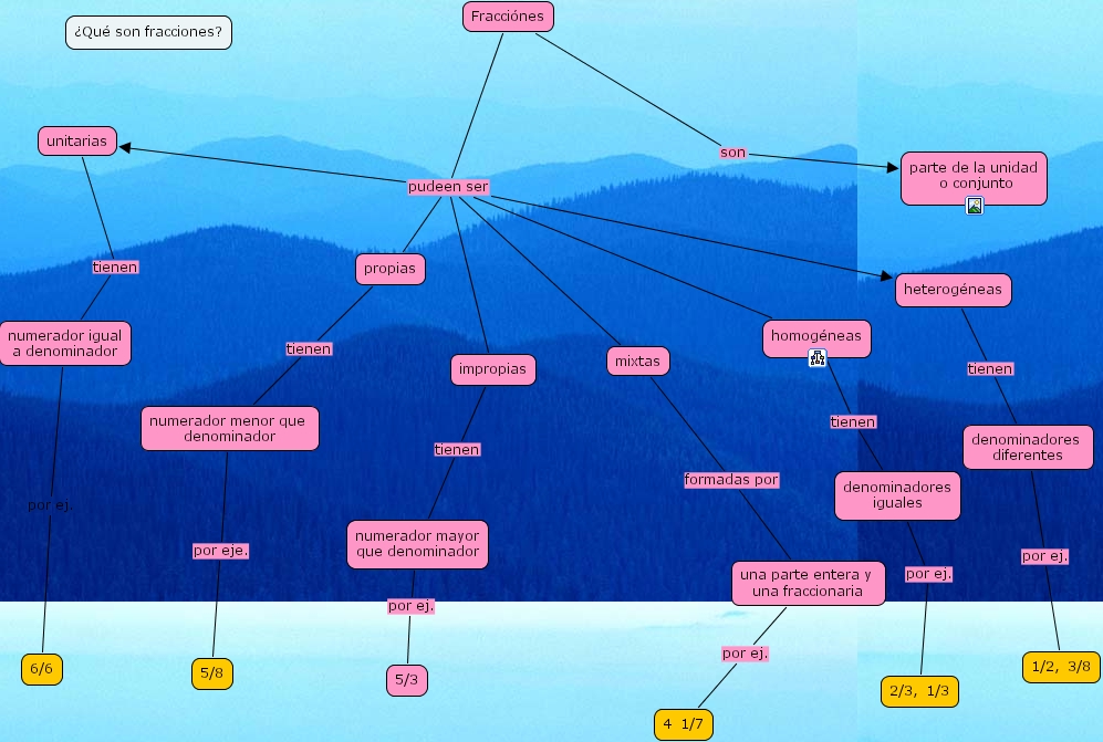 una parte entera y una fraccionaria por ej. 4 1/7, mixtas formadas por una parte entera y una fraccionaria, numerador mayor que denominador por ej. 5/3, numerador menor que denominador por eje. 5/8, numerador igual a denominador por ej. 6/6, impropias tienen numerador mayor que denominador, homog�neas tienen denominadores iguales, denominadores diferentes por ej. 1/2, 3/8, heterog�neas tienen denominadores diferentes, unitarias tienen numerador igual a denominador, Fracci�nes son parte de la unidad o conjunto, Fracci�nes pudeen ser impropias, Fracci�nes pudeen ser mixtas, Fracci�nes pudeen ser propias, Fracci�nes pudeen ser heterog�neas, Fracci�nes pudeen ser unitarias, Fracci�nes pudeen ser homog�neas, propias tienen numerador menor que denominador, denominadores iguales por ej. 2/3, 1/3