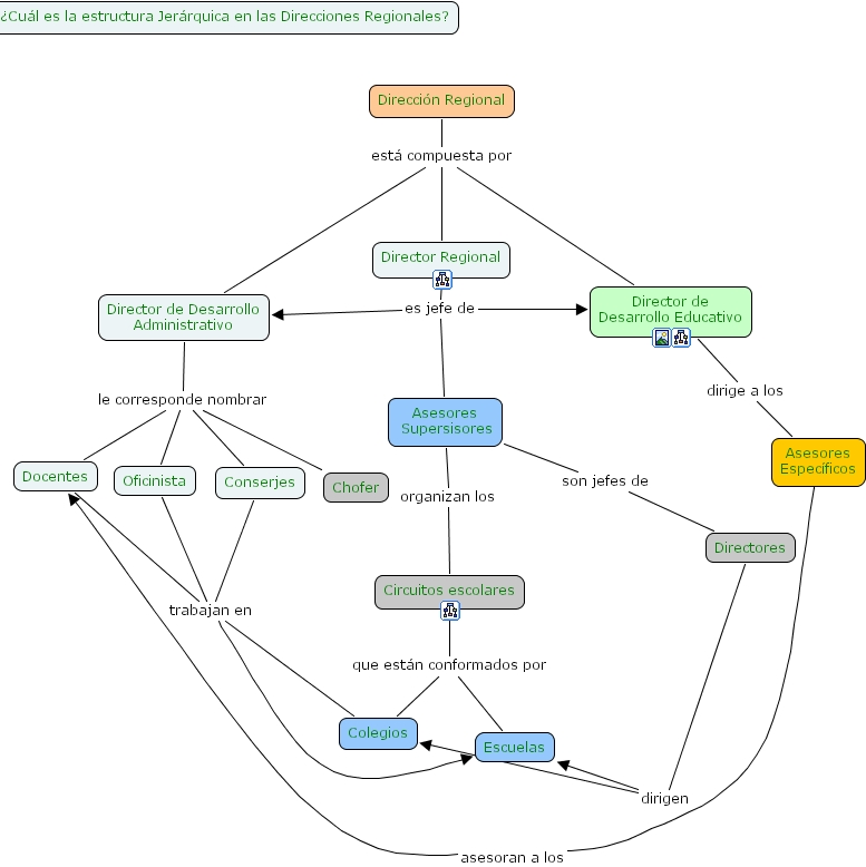 Asesores Supersisores organizan los Circuitos escolares, Asesores Supersisores son jefes de Directores, Directores dirigen Colegios, Directores dirigen Escuelas, Director de Desarrollo Administrativo le corresponde nombrar Chofer, Director de Desarrollo Administrativo le corresponde nombrar Oficinista, Director de Desarrollo Administrativo le corresponde nombrar Conserjes, Director de Desarrollo Administrativo le corresponde nombrar Docentes, Director Regional es jefe de Director de Desarrollo Administrativo, Director Regional es jefe de Director de Desarrollo Educativo, Director Regional es jefe de Asesores Supersisores, Asesores Espec�ficos asesoran a los Docentes, Circuitos escolares que est�n conformados por Escuelas, Circuitos escolares que est�n conformados por Colegios, Docentes trabajan en Escuelas, Docentes trabajan en Colegios, Conserjes trabajan en Escuelas, Conserjes trabajan en Colegios, Direcci�n Regional est� compuesta por Director Regional, Direcci�n Regional est� compuesta por Director de Desarrollo Educativo, Direcci�n Regional est� compuesta por Director de Desarrollo Administrativo, Oficinista trabajan en Escuelas, Oficinista trabajan en Colegios, Director de Desarrollo Educativo dirige a los Asesores Espec�ficos