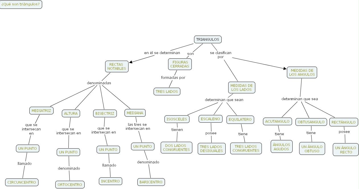 MEDIDAS DE LOS LADOS determinan que sean ESCALENO, MEDIDAS DE LOS LADOS determinan que sean EQUILATERO, MEDIDAS DE LOS LADOS determinan que sean ISOSCELES, ACUTANGULO tiene �NGULOS AGUDOS, BISECTRIZ que se intersecan en UN PUNTO, UN PUNTO llamado CIRCUNCENTRO, TRIANGULOS son FIGURAS CERRADAS, UN PUNTO denominado BARICENTRO, UN PUNTO denominado ORTOCENTRO, MEDIDAS DE LOS ANGULOS determinan que sea RECT�NGULO, MEDIDAS DE LOS ANGULOS determinan que sea OBTUSANGULO, MEDIDAS DE LOS ANGULOS determinan que sea ACUTANGULO, TRIANGULOS se clasifican por MEDIDAS DE LOS ANGULOS, TRIANGULOS se clasifican por MEDIDAS DE LOS LADOS, FIGURAS CERRADAS formadas por TRES LADOS, MEDIATRIZ que se intersecan en UN PUNTO, OBTUSANGULO tiene UN �NGULO OBTUSO, TRIANGULOS en �l se determinan RECTAS NOTABLES, EQUILATERO tiene TRES LADOS CONGRUENTES, RECTAS NOTABLES denominadas MEDIATRIZ, RECTAS NOTABLES denominadas ALTURA, RECTAS NOTABLES denominadas BISECTRIZ, RECTAS NOTABLES denominadas MEDIANA, ISOSCELES tienen DOS LADOS CONGRUENTES, RECT�NGULO posee UN �NGULO RECTO, MEDIANA las tres se intersecan en UN PUNTO, UN PUNTO llamado INCENTRO, ALTURA que se intersecan en UN PUNTO, ESCALENO posee TRES LADOS DESIGUALES
