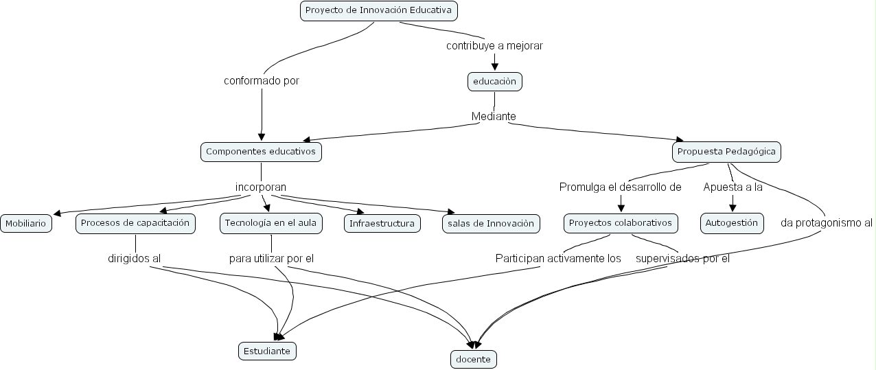 Propuesta Pedag�gica Apuesta a la Autogesti�n, Propuesta Pedag�gica da protagonismo al docente, Propuesta Pedag�gica Promulga el desarrollo de Proyectos colaborativos, Proyectos colaborativos supervisados por el docente, educaci�n Mediante Propuesta Pedag�gica, educaci�n Mediante Componentes educativos, Proyecto de Innovaci�n Educativa contribuye a mejorar educaci�n, Procesos de capacitaci�n dirigidos al Estudiante, Procesos de capacitaci�n dirigidos al docente, Proyecto de Innovaci�n Educativa conformado por Componentes educativos, Tecnolog�a en el aula para utilizar por el docente, Tecnolog�a en el aula para utilizar por el Estudiante, Componentes educativos incorporan salas de Innovaci�n, Componentes educativos incorporan Procesos de capacitaci�n, Componentes educativos incorporan Infraestructura, Componentes educativos incorporan Mobiliario, Componentes educativos incorporan Tecnolog�a en el aula, Proyectos colaborativos Participan activamente los Estudiante