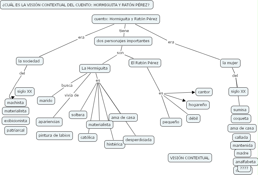 La Hormiguita busca marido, la mujer del siglo XX, la mujer del sumisa, cuento: Hormiguita y Rat�n P�rez era la mujer, cuento: Hormiguita y Rat�n P�rez era la sociedad , la sociedad del siglo XX, El Rat�n P�rez es d�bil, El Rat�n P�rez es hogare�o, El Rat�n P�rez es peque�o, El Rat�n P�rez es cantor, cuento: Hormiguita y Rat�n P�rez tiene dos personajes importantes, cat�lica ???? ????, La Hormiguita viv�a de apariencias, dos personajes importantes son El Rat�n P�rez, dos personajes importantes son La Hormiguita, La Hormiguita es soltera, La Hormiguita es desperdiciada, La Hormiguita es ama de casa, La Hormiguita es hist�rica, La Hormiguita es materialista, La Hormiguita es cat�lica