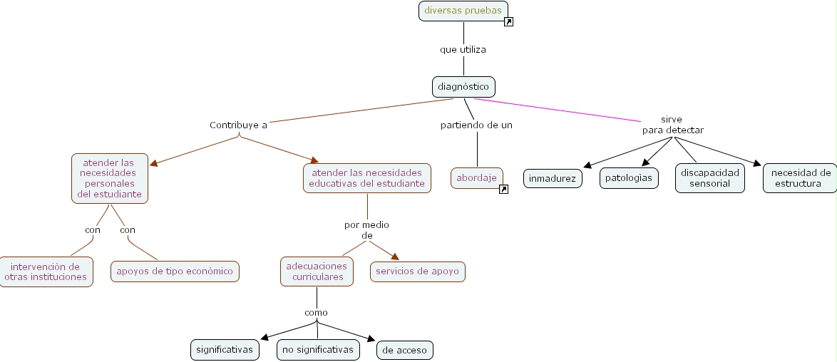 diagn�stico Contribuye a atender las necesidades educativas del estudiante, diagn�stico Contribuye a atender las necesidades personales del estudiante, diagn�stico sirve para detectar patolog�as, diagn�stico sirve para detectar inmadurez, diagn�stico sirve para detectar discapacidad sensorial, diagn�stico sirve para detectar necesidad de estructura , diversas pruebas que utiliza diagn�stico, adecuaciones curriculares como de acceso, adecuaciones curriculares como significativas, adecuaciones curriculares como no significativas, atender las necesidades personales del estudiante con apoyos de tipo econ�mico, diagn�stico partiendo de un abordaje, atender las necesidades educativas del estudiante por medio de adecuaciones curriculares, atender las necesidades educativas del estudiante por medio de servicios de apoyo, atender las necesidades personales del estudiante con intervenci�n de otras instituciones
