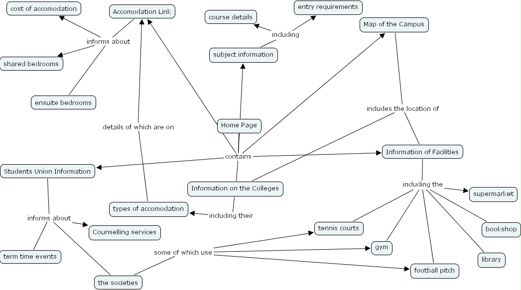 Map of the Campus includes the location of Information on the Colleges, Map of the Campus includes the location of Information of Facilities, Accomodation Link informs about cost of accomodation, Accomodation Link informs about ensuite bedrooms, Accomodation Link informs about shared bedrooms, Home Page contains Accomodation Link, Home Page contains Information of Facilities, Home Page contains Students Union Information, Home Page contains Information on the Colleges, Home Page contains subject information, Home Page contains Map of the Campus, the societies some of which use football pitch, the societies some of which use gym, the societies some of which use tennis courts, subject information including course details, subject information including entry requirements, Information of Facilities including the supermarket, Information of Facilities including the bookshop, Information of Facilities including the football pitch, Information of Facilities including the library, Information of Facilities including the gym, Information of Facilities including the tennis courts, Students Union Information informs about the societies, Students Union Information informs about term time events, Students Union Information informs about Counselling services, Information on the Colleges including their types of accomodation, types of accomodation details of which are on Accomodation Link