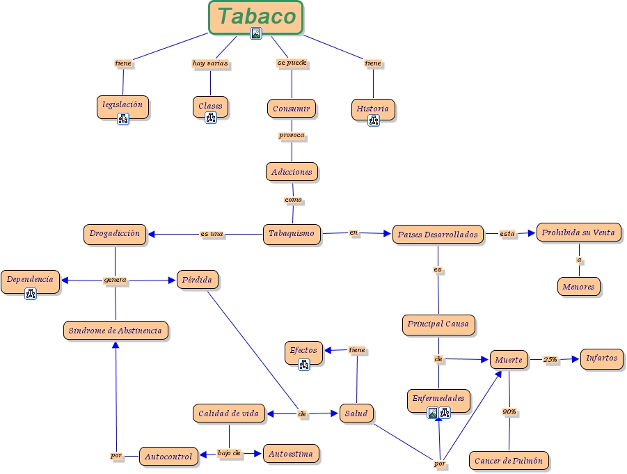 Tabaco hay varias Clases, Tabaco tiene legislaci�n, Paises Desarrollados es Principal Causa, Adicciones como Tabaquismo, Consumir provoca Adicciones, Muerte 25% Infartos, Tabaquismo en Paises Desarrollados, Prohibida su Venta a Menores, P�rdida de Calidad de vida, P�rdida de Salud, Muerte 90% Cancer de Pulm�n, Tabaquismo es una Drogadicci�n, Paises Desarrollados esta Prohibida su Venta, Salud tiene Efectos, Principal Causa de Muerte, Principal Causa de Enfermedades, Tabaco tiene Historia, Drogadicci�n genera Sindrome de Abstinencia, Drogadicci�n genera P�rdida, Drogadicci�n genera Dependencia, Calidad de vida bajo de Autoestima, Calidad de vida bajo de Autocontrol, Salud por Enfermedades, Salud por Muerte, Autocontrol por Sindrome de Abstinencia, Tabaco se puede Consumir
