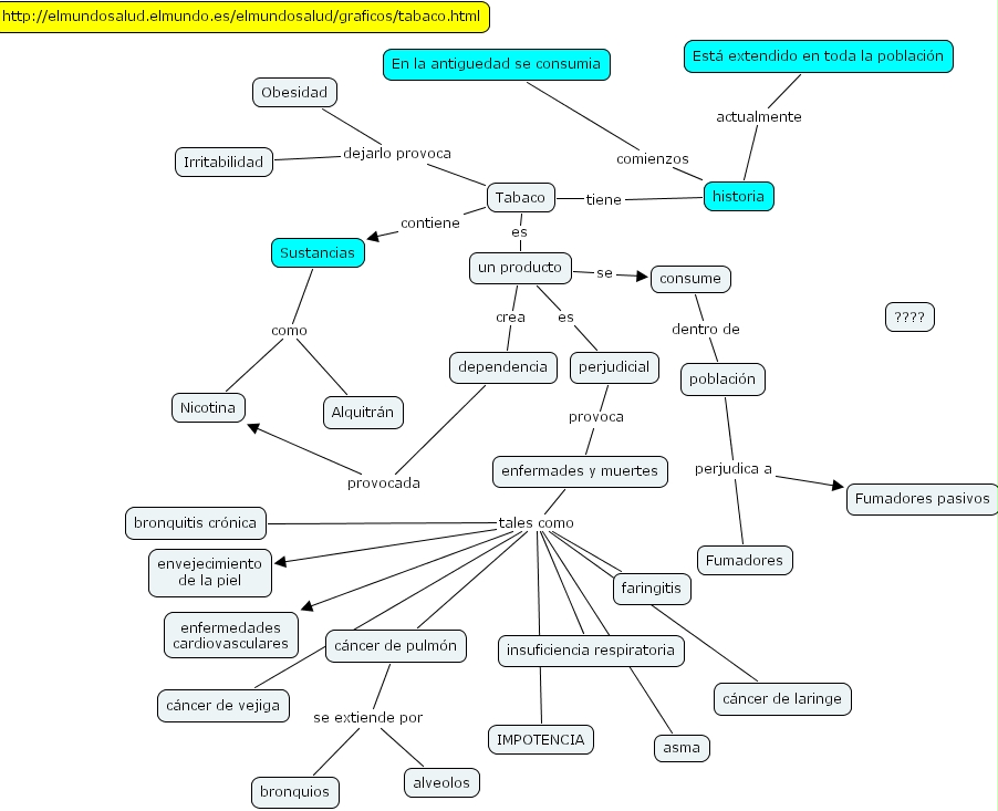 Sustancias como Alquitr�n, Sustancias como Nicotina, un producto es perjudicial, historia actualmente Est� extendido en toda la poblaci�n, Tabaco contiene Sustancias, historia comienzos En la antiguedad se consumia, Tabaco dejarlo provoca Irritabilidad, Tabaco dejarlo provoca Obesidad, un producto crea dependencia, consume dentro de poblaci�n, enfermades y muertes tales como asma, enfermades y muertes tales como envejecimiento de la piel, enfermades y muertes tales como c�ncer de vejiga, enfermades y muertes tales como c�ncer de laringe, enfermades y muertes tales como IMPOTENCIA, enfermades y muertes tales como c�ncer de pulm�n, enfermades y muertes tales como bronquitis cr�nica, enfermades y muertes tales como enfermedades cardiovasculares, enfermades y muertes tales como insuficiencia respiratoria, enfermades y muertes tales como faringitis, dependencia provocada Nicotina, perjudicial provoca enfermades y muertes, poblaci�n perjudica a Fumadores pasivos, poblaci�n perjudica a Fumadores, c�ncer de pulm�n se extiende por alveolos, c�ncer de pulm�n se extiende por bronquios, Tabaco tiene historia, un producto se consume, Tabaco es un producto