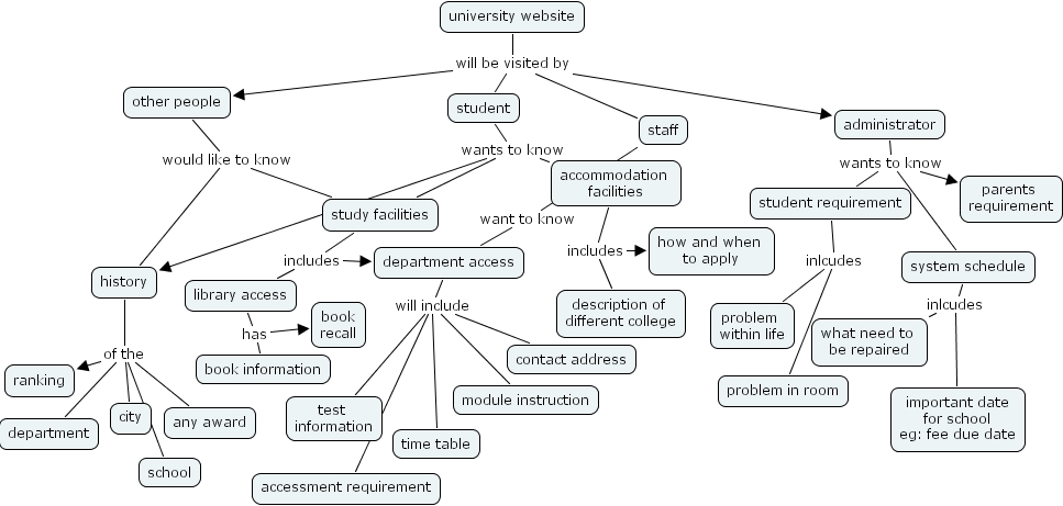 system schedule inlcudes what need to be repaired, system schedule inlcudes important date for school eg: fee due date, university website will be visited by other people, university website will be visited by staff, university website will be visited by student, university website will be visited by administrator, student wants to know accommodation facilities, student wants to know history, student wants to know study facilities, other people would like to know history, other people would like to know study facilities, student requirement inlcudes problem within life, student requirement inlcudes problem in room, administrator wants to know system schedule, administrator wants to know student requirement, administrator wants to know parents requirement, department access will include accessment requirement, department access will include test information, department access will include module instruction, department access will include time table, department access will include contact address, accommodation facilities includes description of different college, accommodation facilities includes how and when to apply, staff want to know department access, history of the ranking, history of the any award, history of the department, history of the city, history of the school, library access has book information, library access has book recall, study facilities includes department access, study facilities includes library access