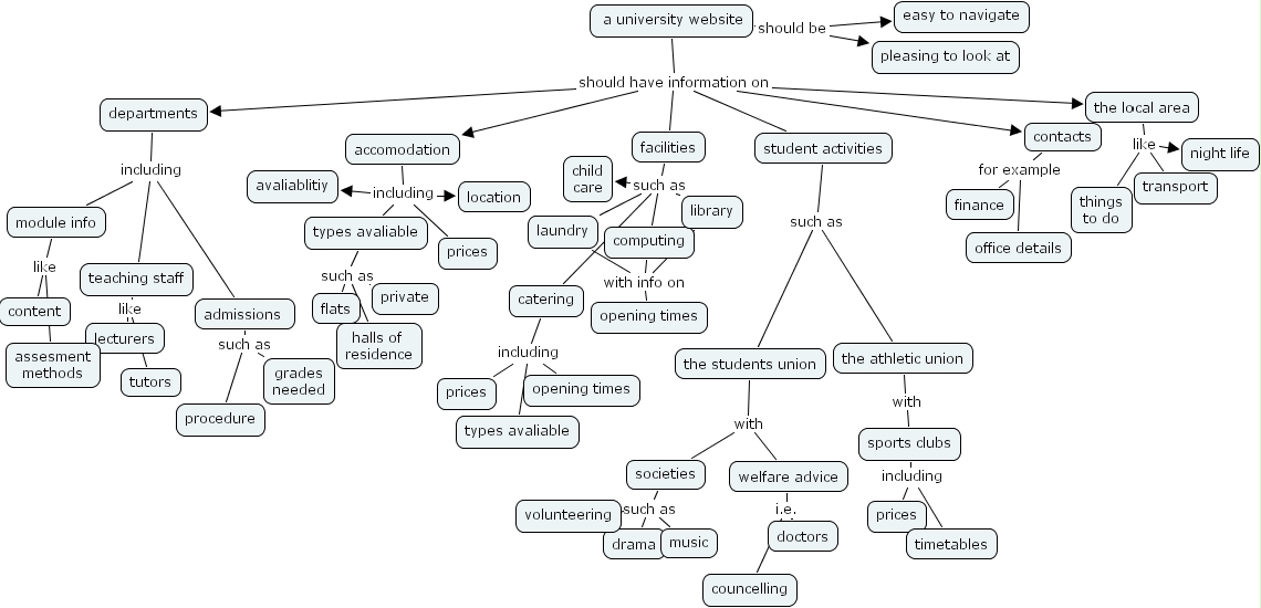 admissions such as grades needed, admissions such as procedure, library with info on opening times, a university website should have information on accomodation, a university website should have information on facilities, a university website should have information on the local area, a university website should have information on departments, a university website should have information on student activities, a university website should have information on contacts, student activities such as the athletic union, student activities such as the students union, a university website should be pleasing to look at, a university website should be easy to navigate, societies such as drama, societies such as music, societies such as volunteering, the local area like transport, the local area like night life, the local area like things to do, welfare advice i.e. doctors, welfare advice i.e. councelling, module info like assesment methods, module info like content, the athletic union with sports clubs, teaching staff like tutors, teaching staff like lecturers, laundry with info on opening times, contacts for example office details, contacts for example finance, departments including admissions , departments including module info, departments including teaching staff, sports clubs including prices, sports clubs including timetables, catering including types avaliable, catering including prices, catering including opening times, types avaliable such as flats, types avaliable such as private, types avaliable such as halls of residence, facilities such as computing, facilities such as library, facilities such as laundry, facilities such as catering, facilities such as child care, the students union with societies, the students union with welfare advice, computing with info on opening times, accomodation including prices, accomodation including location, accomodation including avaliablitiy, accomodation including types avaliable