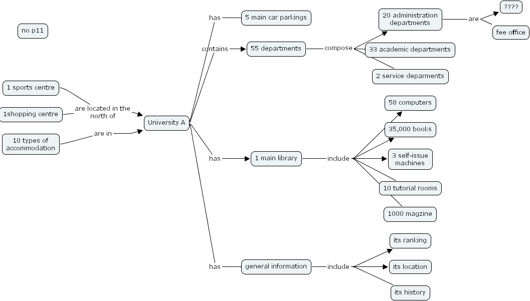 1 sports centre are located in the north of University A, University A has 1 main library, 1shopping centre are located in the north of University A, 1 main library include 10 tutorial rooms, 1 main library include 3 self-issue machines, 1 main library include 35,000 books, 1 main library include 58 computers, 1 main library include 1000 magzine, 55 departments compose 33 academic departments, 55 departments compose 2 service deparments, 55 departments compose 20 administration departments, general information include its ranking, general information include its location, general information include its history, University A contains 55 departments, University A has 5 main car parkings, University A has general information, 20 administration departments are fee office, 20 administration departments are ????, 10 types of accommodation are in University A