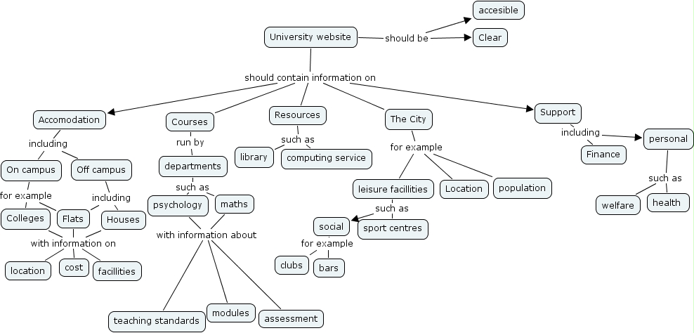 University website should be accesible, University website should be Clear, departments such as psychology, departments such as maths, Support including personal, Support including Finance, The City for example leisure facillities, The City for example population, The City for example Location, Resources such as library, Resources such as computing service, psychology with information about modules, psychology with information about assessment, psychology with information about teaching standards, Flats with information on location, Flats with information on facillities, Flats with information on cost, Houses with information on location, Houses with information on facillities, Houses with information on cost, maths with information about modules, maths with information about assessment, maths with information about teaching standards, leisure facillities such as social, leisure facillities such as sport centres, Colleges with information on location, Colleges with information on facillities, Colleges with information on cost, social for example bars, social for example clubs, Courses run by departments, Off campus including Flats, Off campus including Houses, University website should contain information on The City, University website should contain information on Resources, University website should contain information on Accomodation, University website should contain information on Support, University website should contain information on Courses, personal such as welfare, personal such as health , Accomodation including Off campus, Accomodation including On campus, On campus for example Colleges, On campus for example Flats