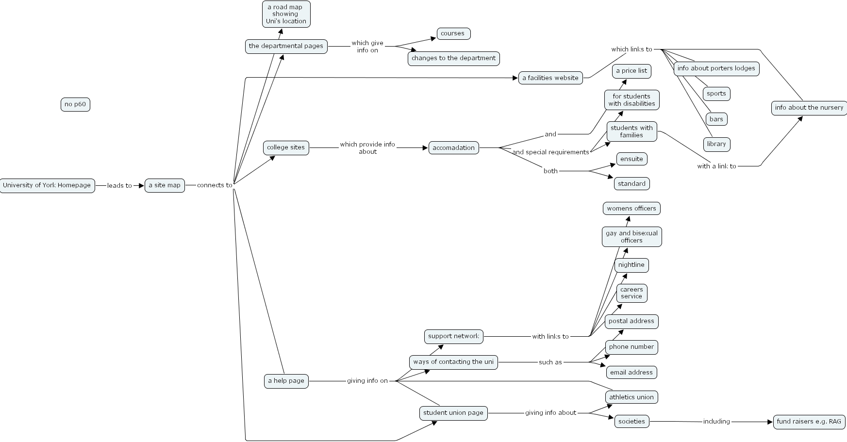 a facilities website which links to library, a facilities website which links to bars, a facilities website which links to info about porters lodges, a facilities website which links to sports, a facilities website which links to info about the nursery, college sites which provide info about accomadation, a site map connects to a facilities website, a site map connects to a road map showing Uni's location, a site map connects to student union page, a site map connects to the departmental pages, a site map connects to a help page, a site map connects to college sites, University of York Homepage leads to a site map, a help page giving info on student union page, a help page giving info on support network, a help page giving info on athletics union, a help page giving info on ways of contacting the uni, accomadation and special requirements students with families, accomadation and special requirements for students with disabilities, support network with links to gay and bisexual officers, support network with links to womens officers, support network with links to careers service, support network with links to nightline, students with families with a link to info about the nursery, student union page giving info about athletics union, student union page giving info about societies, accomadation both standard, accomadation both ensuite, ways of contacting the uni such as postal address, ways of contacting the uni such as phone number, ways of contacting the uni such as email address, societies including fund raisers e.g. RAG, the departmental pages which give info on courses , the departmental pages which give info on changes to the department, accomadation and a price list