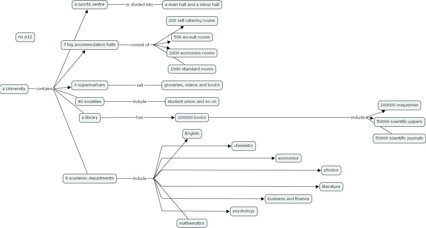 200000 books include 100000 magazines, 200000 books include 50000 scientific papers, 200000 books include 50000 scientific journals, 3 supermarkers sell groceries, videos and books, a library has 200000 books, 7 big accommodation halls consist of 2000 economics rooms, 7 big accommodation halls consist of 500 en-suit rooms, 7 big accommodation halls consist of 1000 standard rooms, 7 big accommodation halls consist of 200 self catering rooms, a sports centre is divided into a main hall and a minor hall, 40 societies include student union and so on, a University contains 40 societies, a University contains 8 academic departments, a University contains a sports centre, a University contains 3 supermarkers, a University contains a library, a University contains 7 big accommodation halls, 8 academic departments include psychology, 8 academic departments include mathematics, 8 academic departments include economics, 8 academic departments include English, 8 academic departments include literature, 8 academic departments include physics, 8 academic departments include chemistry, 8 academic departments include business and finance