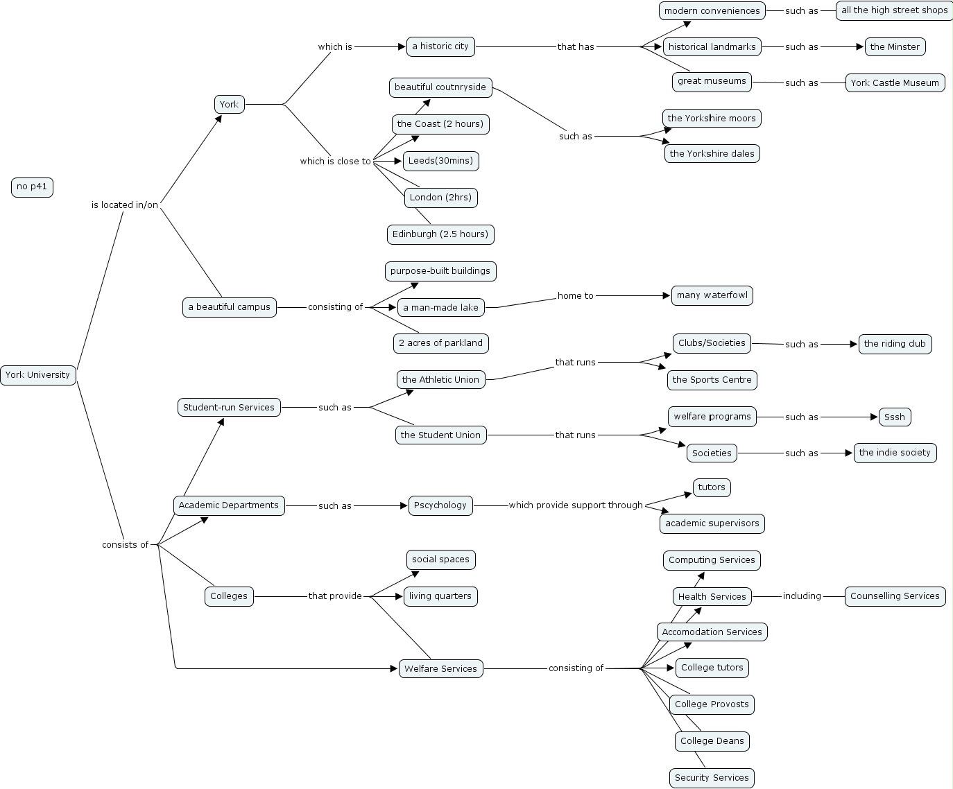 Clubs/Societies such as the riding club, great museums such as York Castle Museum, Colleges that provide Welfare Services, Colleges that provide social spaces, Colleges that provide living quarters, modern conveniences such as all the high street shops, a man-made lake home to many waterfowl, Health Services including Counselling Services, the Athletic Union that runs the Sports Centre, the Athletic Union that runs Clubs/Societies, Academic Departments such as Pscychology, the Student Union that runs welfare programs, the Student Union that runs Societies, Societies such as the indie society, York University consists of Colleges, York University consists of Welfare Services, York University consists of Student-run Services, York University consists of Academic Departments, beautiful coutnryside such as the Yorkshire moors, beautiful coutnryside such as the Yorkshire dales, a historic city that has historical landmarks, a historic city that has great museums, a historic city that has modern conveniences, Welfare Services consisting of College Deans, Welfare Services consisting of College Provosts, Welfare Services consisting of Computing Services, Welfare Services consisting of Health Services, Welfare Services consisting of Accomodation Services, Welfare Services consisting of College tutors, Welfare Services consisting of Security Services, Pscychology which provide support through academic supervisors, Pscychology which provide support through tutors, York University is located in/on a beautiful campus, York University is located in/on York, historical landmarks such as the Minster, a beautiful campus consisting of 2 acres of parkland, a beautiful campus consisting of purpose-built buildings, a beautiful campus consisting of a man-made lake, York which is a historic city, York which is close to the Coast (2 hours), York which is close to Leeds(30mins), York which is close to Edinburgh (2.5 hours), York which is close to London (2hrs), York which is close to beautiful coutnryside, welfare programs such as Sssh, Student-run Services such as the Athletic Union, Student-run Services such as the Student Union