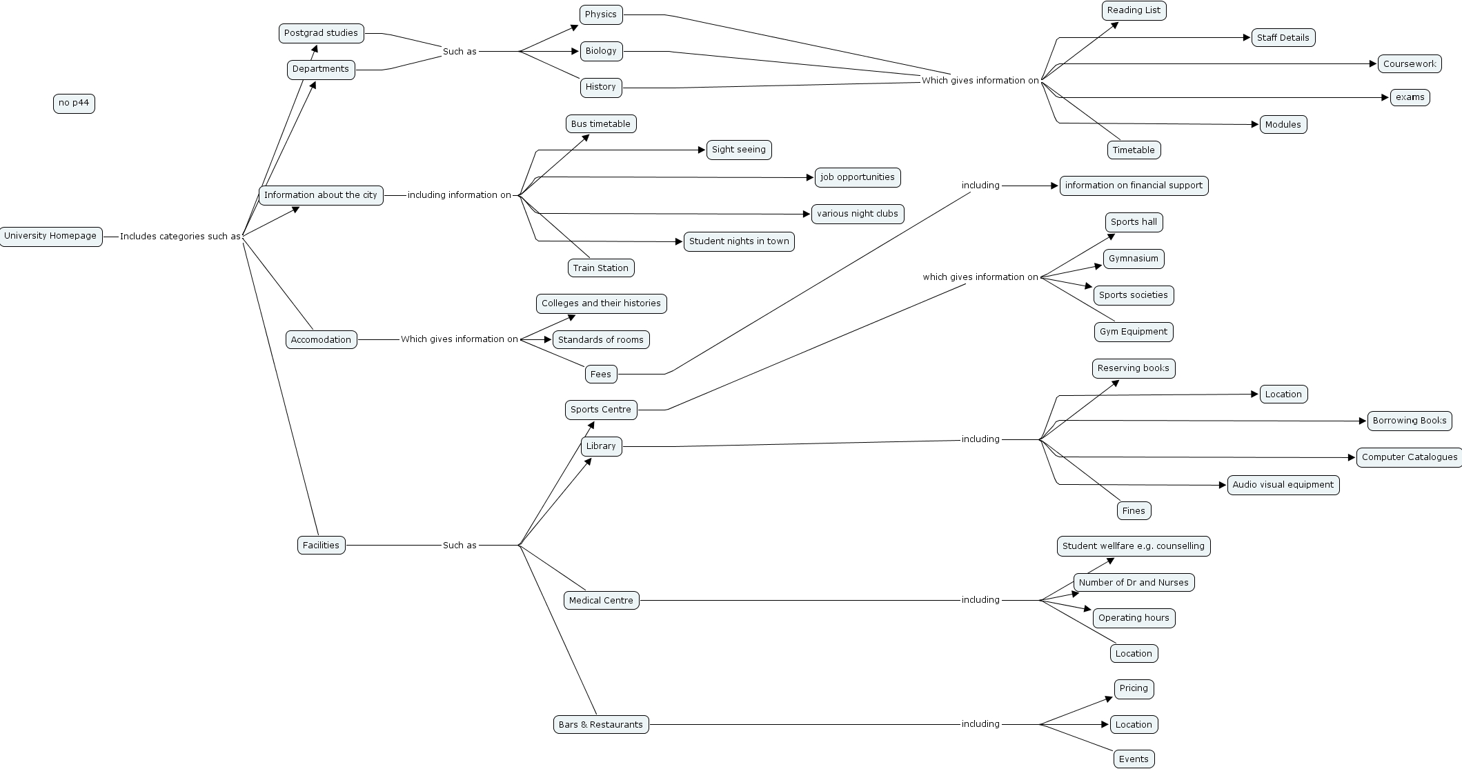 Accomodation Which gives information on Standards of rooms, Accomodation Which gives information on Fees, Accomodation Which gives information on Colleges and their histories, Physics Which gives information on Reading List, Physics Which gives information on Timetable, Physics Which gives information on Modules, Physics Which gives information on exams, Physics Which gives information on Coursework, Physics Which gives information on Staff Details, Information about the city including information on Sight seeing, Information about the city including information on Bus timetable, Information about the city including information on job opportunities, Information about the city including information on Train Station, Information about the city including information on Student nights in town, Information about the city including information on various night clubs, Medical Centre including Location, Medical Centre including Number of Dr and Nurses, Medical Centre including Student wellfare e.g. counselling, Medical Centre including Operating hours, Facilities Such as Medical Centre, Facilities Such as Bars & Restaurants, Facilities Such as Sports Centre, Facilities Such as Library, Biology Which gives information on Reading List, Biology Which gives information on Timetable, Biology Which gives information on Modules, Biology Which gives information on exams, Biology Which gives information on Coursework, Biology Which gives information on Staff Details, Departments Such as Physics, Departments Such as Biology, Departments Such as History, University Homepage Includes categories such as Postgrad studies, University Homepage Includes categories such as Departments, University Homepage Includes categories such as Information about the city, University Homepage Includes categories such as Accomodation, University Homepage Includes categories such as Facilities, Library including Computer Catalogues, Library including Reserving books, Library including Location, Library including Audio visual equipment, Library including Borrowing Books, Library including Fines, Fees including information on financial support, Bars & Restaurants including Location, Bars & Restaurants including Events, Bars & Restaurants including Pricing, Postgrad studies Such as Physics, Postgrad studies Such as Biology, Postgrad studies Such as History, History Which gives information on Reading List, History Which gives information on Timetable, History Which gives information on Modules, History Which gives information on exams, History Which gives information on Coursework, History Which gives information on Staff Details, Sports Centre which gives information on Sports societies, Sports Centre which gives information on Gymnasium, Sports Centre which gives information on Sports hall, Sports Centre which gives information on Gym Equipment