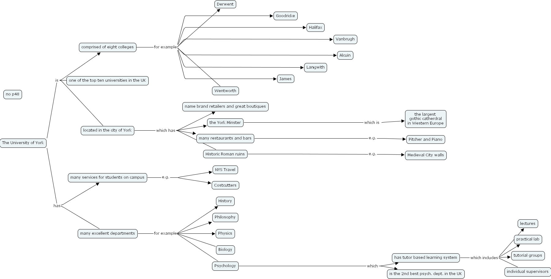 Psychology which has tutor based learning system, Psychology which is the 2nd best psych. dept. in the UK, The University of York is one of the top ten universities in the UK, The University of York is comprised of eight colleges, The University of York is located in the city of York, comprised of eight colleges for example Vanbrugh, comprised of eight colleges for example Halifax, comprised of eight colleges for example James, comprised of eight colleges for example Wentworth, comprised of eight colleges for example Goodricke, comprised of eight colleges for example Langwith, comprised of eight colleges for example Derwent, comprised of eight colleges for example Alcuin, The University of York has many excellent departments, The University of York has many services for students on campus, the York Minster which is the largest gothic catherdral in Western Europe, many services for students on campus e.g. NYS Travel, many services for students on campus e.g. Costcutters, many excellent departments for example Psychology, many excellent departments for example Biology, many excellent departments for example History, many excellent departments for example Physics, many excellent departments for example Philosophy, many restaurants and bars e.g. Pitcher and Piano, has tutor based learning system which includes practical lab, has tutor based learning system which includes tutorial groups, has tutor based learning system which includes lectures, has tutor based learning system which includes individual supervisors, located in the city of York which has the York Minster, located in the city of York which has Historic Roman ruins, located in the city of York which has name brand retailers and great boutiques, located in the city of York which has many restaurants and bars, Historic Roman ruins e.g. Medieval City walls