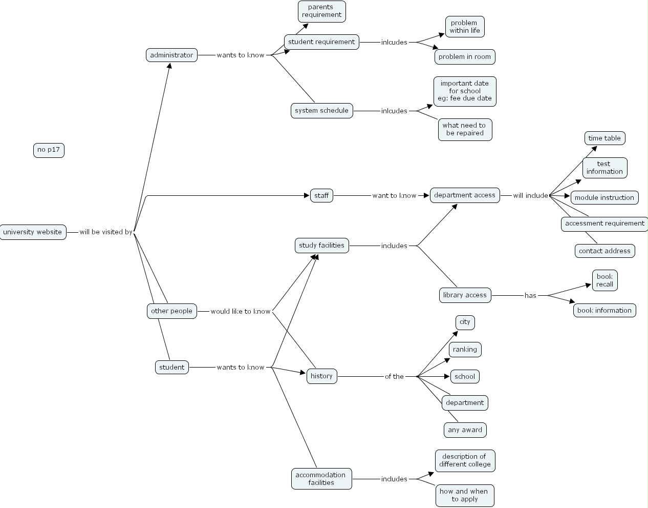 department access will include time table, department access will include accessment requirement, department access will include module instruction, department access will include test information, department access will include contact address, university website will be visited by student, university website will be visited by staff, university website will be visited by administrator, university website will be visited by other people, student wants to know study facilities, student wants to know history, student wants to know accommodation facilities, history of the school, history of the department, history of the ranking, history of the any award, history of the city, study facilities includes library access, study facilities includes department access, staff want to know department access, other people would like to know study facilities, other people would like to know history, accommodation facilities includes description of different college, accommodation facilities includes how and when to apply, system schedule inlcudes what need to be repaired, system schedule inlcudes important date for school eg: fee due date, student requirement inlcudes problem within life, student requirement inlcudes problem in room, administrator wants to know student requirement, administrator wants to know system schedule, administrator wants to know parents requirement, library access has book information, library access has book recall