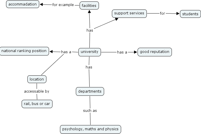 location accessable by rail, bus or car, university has support services, university has facilities, facilities for example accommadation, departments such as psychology, maths and physics, university has a good reputation, support services for students, university has a national ranking position, university has a location, university has departments