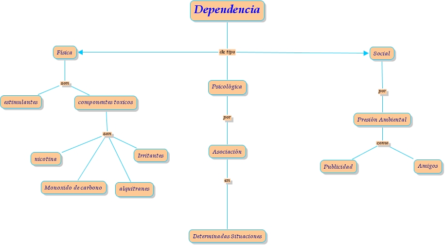 Dependencia de tipo F�sica, Dependencia de tipo Psicol�gica, Dependencia de tipo Social, Social por Presi�n Ambiental, F�sica son componentes toxicos, F�sica son estimulantes, componentes toxicos son nicotina, componentes toxicos son Irritantes, componentes toxicos son alquitranes, componentes toxicos son Monoxido de carbono, Psicol�gica por Asociaci�n, Asociaci�n en Determinadas Situaciones, Presi�n Ambiental como Publicidad, Presi�n Ambiental como Amigos