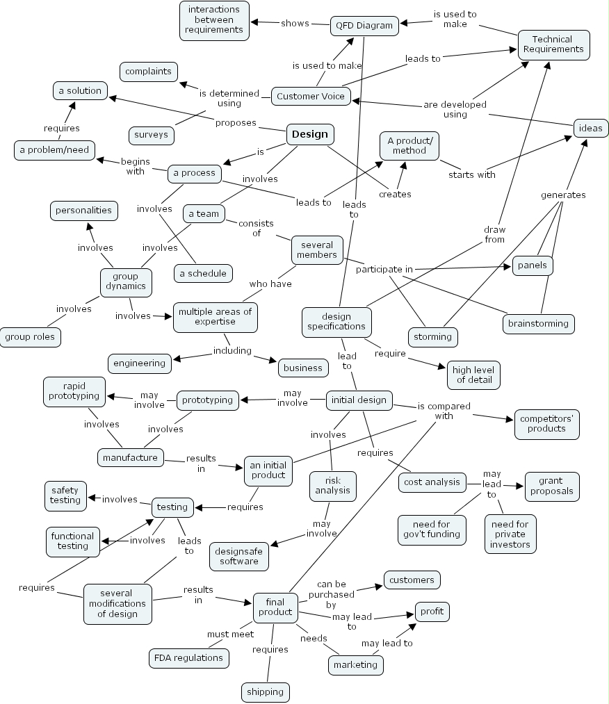 a problem/need requires a solution, a process involves a schedule, an initial product requires testing, a process begins with a problem/need, several modifications of design requires testing, several modifications of design results in final product, a team involves group dynamics, group dynamics involves group roles, ideas are developed using Customer Voice, ideas are developed using Technical Requirements, risk analysis may involve designsafe software, final product can be purchased by customers, prototyping involves manufacture, brainstorming generates ideas, a team consists of several members, manufacture results in an initial product, Customer Voice is used to make QFD Diagram, multiple areas of expertise including business, multiple areas of expertise including engineering, an initial product is compared with competitors' products, design specifications draw from Technical Requirements, design specifications require high level of detail, rapid prototyping involves manufacture, cost analysis may lead to need for gov't funding, cost analysis may lead to need for private investors, cost analysis may lead to grant proposals, final product is compared with competitors' products, initial design involves risk analysis, panels generates ideas, QFD Diagram shows interactions between requirements, testing involves safety testing, several members who have multiple areas of expertise, Design is a process, design specifications lead to initial design, group dynamics involves multiple areas of expertise, several members participate in storming, several members participate in panels, several members participate in brainstorming, A product/ method starts with ideas, QFD Diagram leads to design specifications, initial design is compared with competitors' products, final product needs marketing, prototyping may involve rapid prototyping, Design involves a team, final product must meet FDA regulations, a process leads to A product/ method, testing involves functional testing, marketing may lead to profit, Technical Requirements is used to make QFD Diagram, Customer Voice leads to Technical Requirements, final product may lead to profit, final product requires shipping, storming generates ideas, group dynamics involves personalities, Customer Voice is determined using surveys, Customer Voice is determined using complaints, Design creates A product/ method, testing leads to several modifications of design, Design proposes a solution, initial design requires cost analysis, initial design may involve prototyping