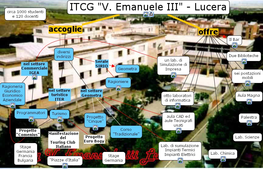 Turismo Manifestazione del Touring Club Italiano "Piazze d'Italia", Ragioneria Giuridico Economico Aziendale Progetto "Comenius" Stage Germania Francia Bulgaria, un lab. di Simulazione di Impresa nel settore Commerciale IGEA Ragioneria Giuridico Economico Aziendale, un lab. di Simulazione di Impresa nel settore Commerciale IGEA Programmatori, aula CAD ed aule Tecnigrafi usati nel settore Geometra Corso "Tradizionale", aula CAD ed aule Tecnigrafi usati nel settore Geometra Progetto "Cinque", diversi indirizzi nel settore Commerciale IGEA Ragioneria Giuridico Economico Aziendale, diversi indirizzi nel settore Commerciale IGEA Programmatori, diversi indirizzi nel settore turistico ITER Turismo, diversi indirizzi nel settore Geometra Corso "Tradizionale", diversi indirizzi nel settore Geometra Progetto "Cinque", ITCG "V. Emanuele III" - Lucera offre sei postazioni mobili, ITCG "V. Emanuele III" - Lucera offre otto laboratori di informatica, ITCG "V. Emanuele III" - Lucera offre Lab. Scienze, ITCG "V. Emanuele III" - Lucera offre aula CAD ed aule Tecnigrafi usati, ITCG "V. Emanuele III" - Lucera offre Palestra, ITCG "V. Emanuele III" - Lucera offre Due Biblioteche, ITCG "V. Emanuele III" - Lucera offre Il Bar, ITCG "V. Emanuele III" - Lucera offre Lab. Chimica, ITCG "V. Emanuele III" - Lucera offre Aula Magna, ITCG "V. Emanuele III" - Lucera offre un lab. di Simulazione di Impresa, ITCG "V. Emanuele III" - Lucera offre Lab. di sumulazione Impianti Termici Impianti Elettrici, diversi indirizzi Serale SIRIO Geometra, diversi indirizzi Serale SIRIO Ragioniere, ITCG "V. Emanuele III" - Lucera accoglie circa 1000 studenti e 120 docenti, ITCG "V. Emanuele III" - Lucera accoglie diversi indirizzi, Lab. di sumulazione Impianti Termici Impianti Elettrici nel settore Geometra Corso "Tradizionale", Lab. di sumulazione Impianti Termici Impianti Elettrici nel settore Geometra Progetto "Cinque", Turismo Progetto Euro Bogy Stage Germania, Turismo Progetto "Comenius" Stage Germania Francia Bulgaria