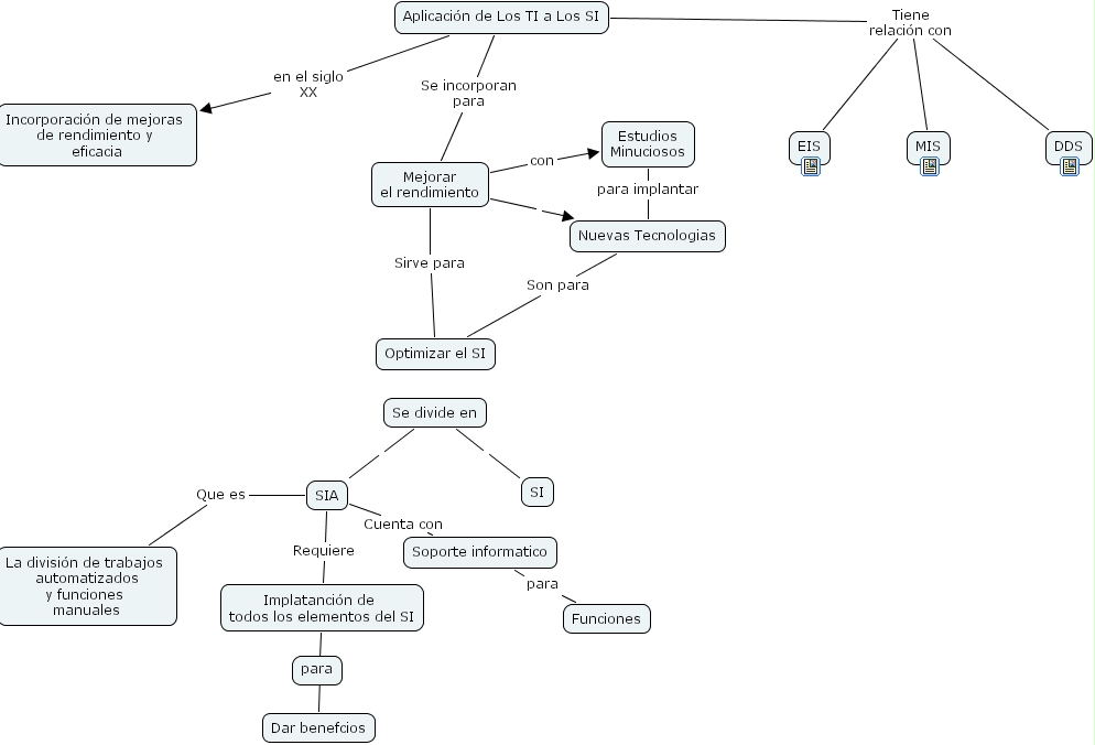 SIA Que es La divisi�n de trabajos automatizados y funciones manuales, SIA Requiere Implatanci�n de todos los elementos del SI, SIA Cuenta con Soporte informatico, Aplicaci�n de Los TI a Los SI Se incorporan para Mejorar el rendimiento, Se divide en SIA, Mejorar el rendimiento Sirve para Optimizar el SI, Implatanci�n de todos los elementos del SI ???? Dar benefcios, Aplicaci�n de Los TI a Los SI Tiene relaci�n con MIS, Aplicaci�n de Los TI a Los SI Tiene relaci�n con EIS, Aplicaci�n de Los TI a Los SI Tiene relaci�n con DDS, Mejorar el rendimiento con Estudios Minuciosos, Aplicaci�n de Los TI a Los SI en el siglo XX Incorporaci�n de mejoras de rendimiento y eficacia, Estudios Minuciosos para implantar Nuevas Tecnologias, Mejorar el rendimiento Nuevas Tecnologias, Soporte informatico para Funciones, Nuevas Tecnologias Son para Optimizar el SI, Se divide en SI