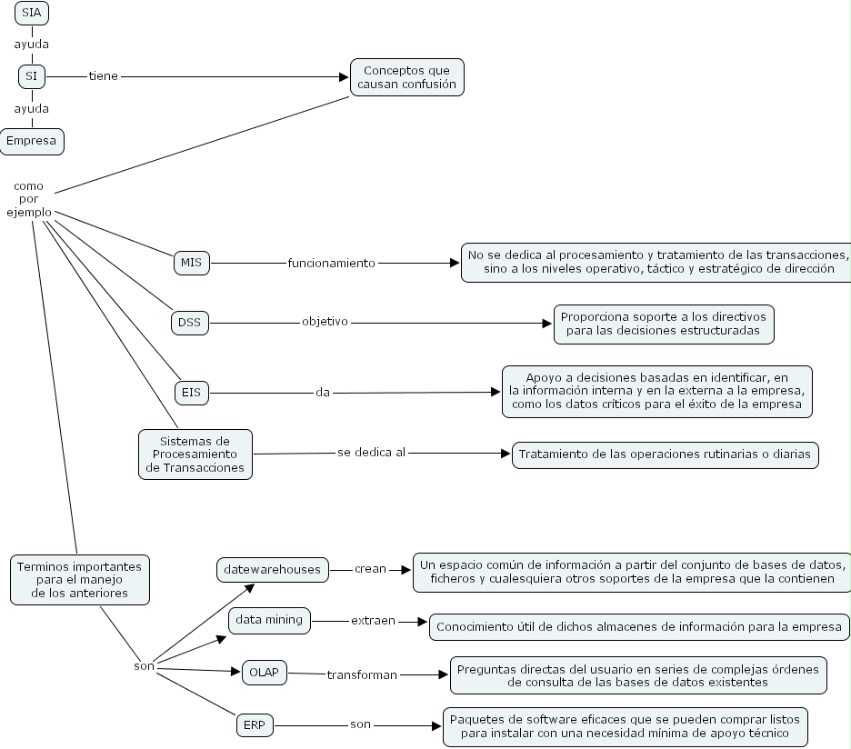 SIA ayuda SI, SI tiene Conceptos que causan confusi�n, Sistemas de Procesamiento de Transacciones se dedica al Tratamiento de las operaciones rutinarias o diarias, SI ayuda Empresa, DSS objetivo Proporciona soporte a los directivos para las decisiones estructuradas, OLAP transforman Preguntas directas del usuario en series de complejas �rdenes de consulta de las bases de datos existentes, ERP son Paquetes de software eficaces que se pueden comprar listos para instalar con una necesidad m�nima de apoyo t�cnico, datewarehouses crean Un espacio com�n de informaci�n a partir del conjunto de bases de datos, ficheros y cualesquiera otros soportes de la empresa que la contienen, MIS funcionamiento No se dedica al procesamiento y tratamiento de las transacciones, sino a los niveles operativo, t�ctico y estrat�gico de direcci�n, Terminos importantes para el manejo de los anteriores son data mining, Terminos importantes para el manejo de los anteriores son OLAP, Terminos importantes para el manejo de los anteriores son datewarehouses, Terminos importantes para el manejo de los anteriores son ERP, Conceptos que causan confusi�n como por ejemplo Sistemas de Procesamiento de Transacciones, Conceptos que causan confusi�n como por ejemplo DSS, Conceptos que causan confusi�n como por ejemplo Terminos importantes para el manejo de los anteriores, Conceptos que causan confusi�n como por ejemplo EIS, Conceptos que causan confusi�n como por ejemplo MIS, data mining extraen Conocimiento �til de dichos almacenes de informaci�n para la empresa, EIS da Apoyo a decisiones basadas en identificar, en la informaci�n interna y en la externa a la empresa, como los datos cr�ticos para el �xito de la empresa