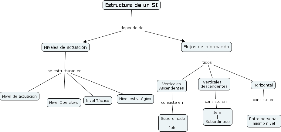 Niveles de actuaci�n se estructuran en Nivel T�ctico, Niveles de actuaci�n se estructuran en Nivel estrat�gico, Niveles de actuaci�n se estructuran en Nivel Operativo, Niveles de actuaci�n se estructuran en Nivel de actuaci�n, Flujos de informaci�n tipos Verticales descendentes, Flujos de informaci�n tipos Verticales Ascendentes, Flujos de informaci�n tipos Horizontal, Verticales descendentes consiste en Jefe | Subordinado, Horizontal consiste en Entre personas mismo nivel, Verticales Ascendentes consiste en Subordinado | Jefe, Estructura de un SI depende de Flujos de informaci�n, Estructura de un SI depende de Niveles de actuaci�n