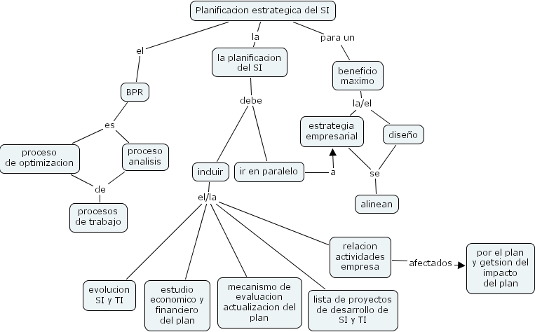 ir en paralelo a estrategia empresarial, Planificacion estrategica del SI para un beneficio maximo, Planificacion estrategica del SI el BPR, beneficio maximo la/el dise�o, beneficio maximo la/el estrategia empresarial, proceso de optimizacion de procesos de trabajo, BPR es proceso de optimizacion, BPR es proceso analisis, la planificacion del SI debe incluir, la planificacion del SI debe ir en paralelo, incluir el/la mecanismo de evaluacion actualizacion del plan, incluir el/la estudio economico y financiero del plan, incluir el/la relacion actividades empresa, incluir el/la lista de proyectos de desarrollo de SI y TI, incluir el/la evolucion SI y TI, estrategia empresarial se alinean, proceso analisis de procesos de trabajo, dise�o se alinean, relacion actividades empresa afectados por el plan y getsion del impacto del plan, Planificacion estrategica del SI la la planificacion del SI