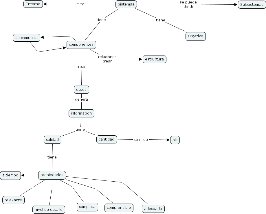 datos genera informacion, se comunica componentes, propiedades relevante, calidad tiene propiedades, componentes crear datos, informacion tiene cantidad, informacion tiene calidad, propiedades completa, componentes relaciones crean estructura, propiedades nivel de detalle, propiedades comprensible, cantidad se mide bit, Sistemas se puede dividir Subsistemas, Sistemas tiene Objetivo, Sistemas limita Entorno, propiedades adecuada, propiedades a tiempo, Sistemas tiene componentes