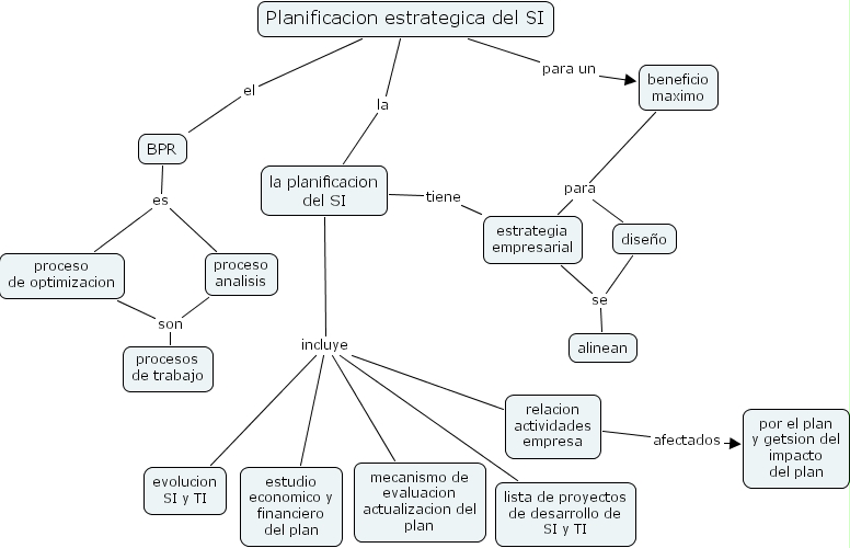 proceso de optimizacion son procesos de trabajo, BPR es proceso de optimizacion, BPR es proceso analisis, la planificacion del SI tiene estrategia empresarial, relacion actividades empresa afectados por el plan y getsion del impacto del plan, Planificacion estrategica del SI para un beneficio maximo, estrategia empresarial se alinean, Planificacion estrategica del SI la la planificacion del SI, beneficio maximo para dise�o, beneficio maximo para estrategia empresarial, Planificacion estrategica del SI el BPR, proceso analisis son procesos de trabajo, dise�o se alinean, la planificacion del SI incluye mecanismo de evaluacion actualizacion del plan, la planificacion del SI incluye relacion actividades empresa, la planificacion del SI incluye evolucion SI y TI, la planificacion del SI incluye estudio economico y financiero del plan, la planificacion del SI incluye lista de proyectos de desarrollo de SI y TI