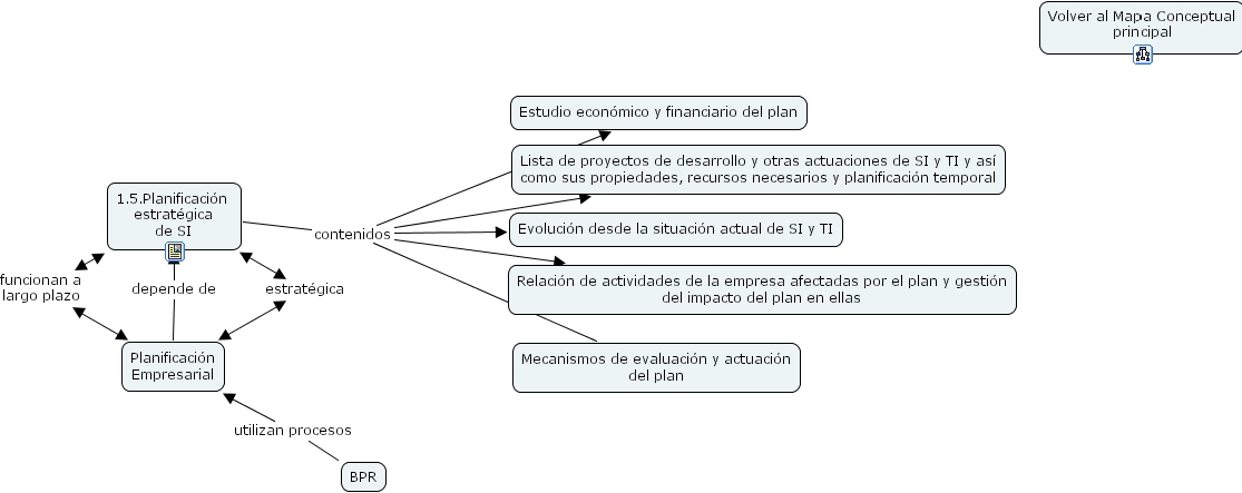 1.5.Planificaci�n estrat�gica de SI contenidos Evoluci�n desde la situaci�n actual de SI y TI, 1.5.Planificaci�n estrat�gica de SI contenidos Mecanismos de evaluaci�n y actuaci�n del plan, 1.5.Planificaci�n estrat�gica de SI contenidos Lista de proyectos de desarrollo y otras actuaciones de SI y TI y as� como sus propiedades, recursos necesarios y planificaci�n temporal, 1.5.Planificaci�n estrat�gica de SI contenidos Estudio econ�mico y financiario del plan, 1.5.Planificaci�n estrat�gica de SI contenidos Relaci�n de actividades de la empresa afectadas por el plan y gesti�n del impacto del plan en ellas, 1.5.Planificaci�n estrat�gica de SI estrat�gica Planificaci�n Empresarial, BPR utilizan procesos Planificaci�n Empresarial, Planificaci�n Empresarial depende de 1.5.Planificaci�n estrat�gica de SI